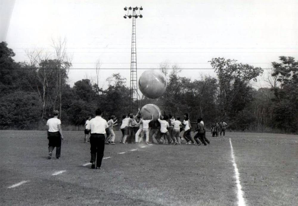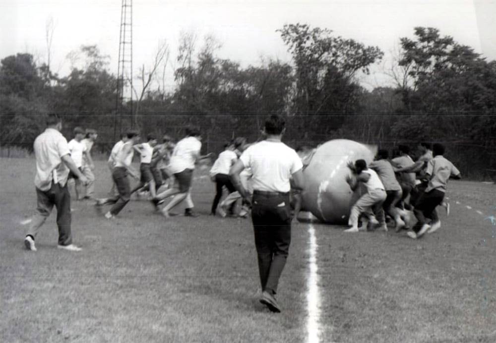 Pushball was a big thing, literally and figuratively, in the 1960s. The object was for your team to push this giant ball (6 feet in diameter weighing 50 pounds) down the field and get it across the goal line. Sometimes two balls were employed, one large and one a bit smaller. Two teams of eleven each (five forwards, two left-wings, two right-wings and two goal-keepers) pushed the ball downfield. The goals consisted of two upright posts 18 feet high and 20 feet apart with a crossbar seven feet from the ground. The game lasts for two periods with an intermission. Pushing the ball under the bar counted as five points. Lifting or throwing the ball over the bar counted as eight points. A touchdown behind goal for a safety counted as two points. The contests were sponsored by the Department of Parks and Recreation. These images show a Pittsburgh Pushball championship game at Moore Park on July 26, 1968. * Photos provided by Mike Radley * |