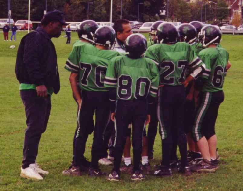 The Knights huddle up around coaches Joe Nicholas and Earl Taylor.