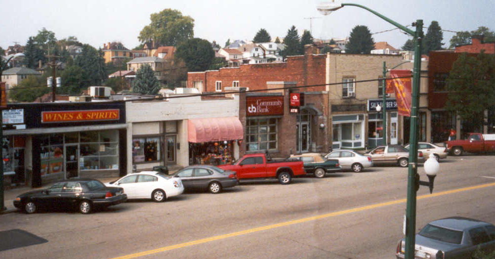 The 39-Brookline trolley car passes the 700 block of Brookline Boulevard in 1966. Note the old businesses, many of which ceased operating long ago. From left, Hilltop Music Center, the State Store, Metropolitan Cleaners, Anderson Radio and Appliance store, a bank, Star Shoe Service, Sal's Barber Shop, Premier Photo and Party Cake Bakery. The 700 Block on Brookline Boulevard in 2004. |