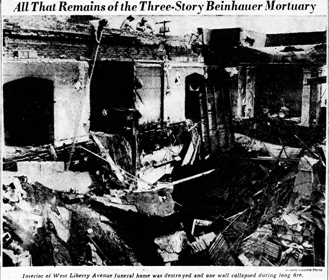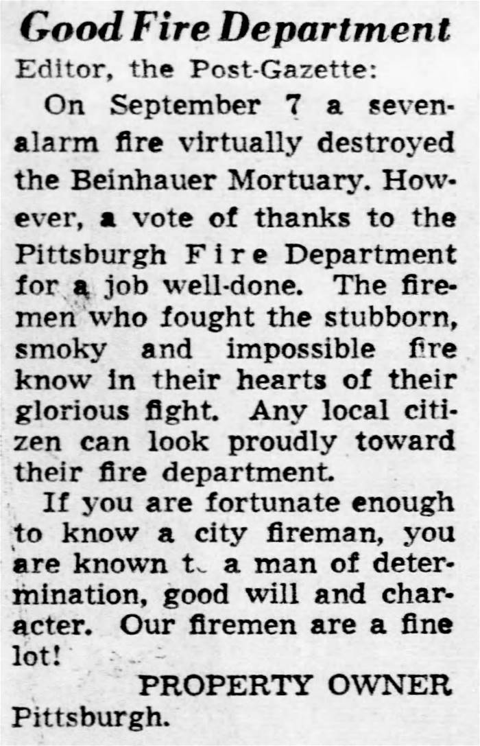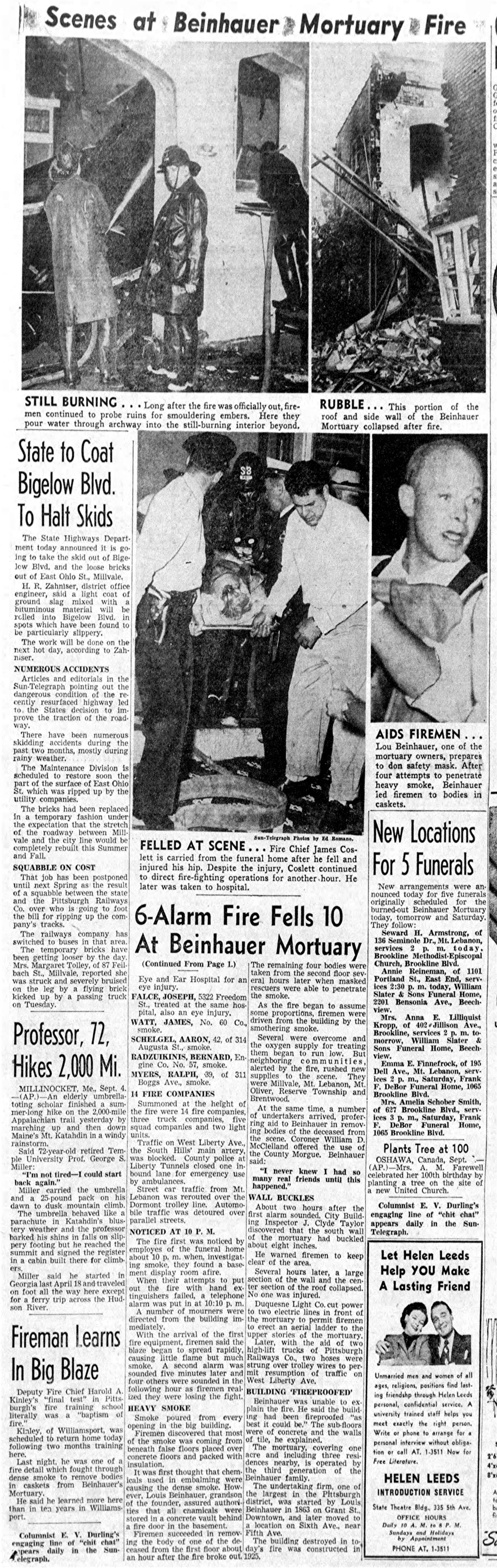 <><><><> <><><><> <><><><> <><><><> <><><><> <><><><> Fire Destroys Mortuary Building - September 3/4, 1952 Tragedy struck on September 4, 1952, when a seven-alarm fire caused irreparable damage to the mortuary building. Scarred walls and charred timbers were all that remained of the thirty-one year old building. The family quickly rebounded from the loss, and a new funeral parlor was constructed shortly afterwards on the same location, one that has been continually enlarged and modernized to this day. <><><><> <><><><> <><><><> <><><><> <><><><> <><><><> Pittsburgh Press, Post-Gazette and Sun-Telegraph Articles * Click on images for readable versions of newspaper pages * <><><><> <><><><> <><><><> <><><><> <><><><> <><><><> The Beinhauer's Brookline Connection Although Beinhauer Funeral Home is located in Beechview, it is often the site of services for residents of the Brookline community, there is another interesting "Brookline Connection" involving the Beinhauer family business. The DeBor family, owners of DeBor Funeral Home on Brookline Boulevard, got their start in the mortuary business at Beinhauer's. Frank F. DeBor, founder of DeBor Funeral Home, had strong ties to the Beinhauer family. His parents, Frank M. and Anna DeBor, both worked for the Beinhauer Funeral Home. Anna was the grand-daughter of Louis Beinhauer, the founder of the Beinhauer family business. Frank also began working for the Beinhauers, and was soon busy arranging and conducting funerals. He and his wife Mary Jo lived for a while on the Beinhauer estate on West Liberty Avenue. In 1950, the DeBor's left Beinhauers to start their own funeral parlor at 1065 Brookline Boulevard.