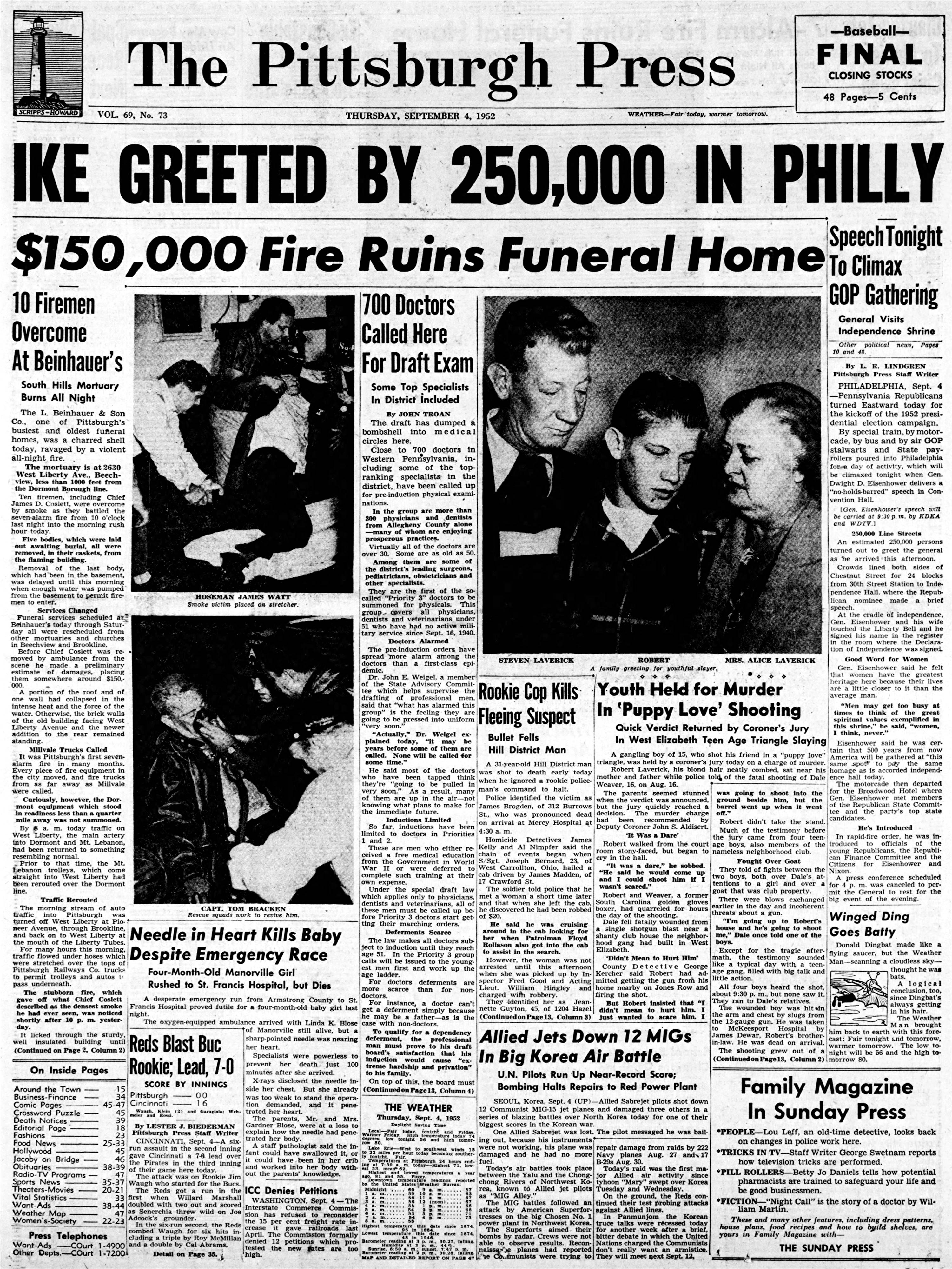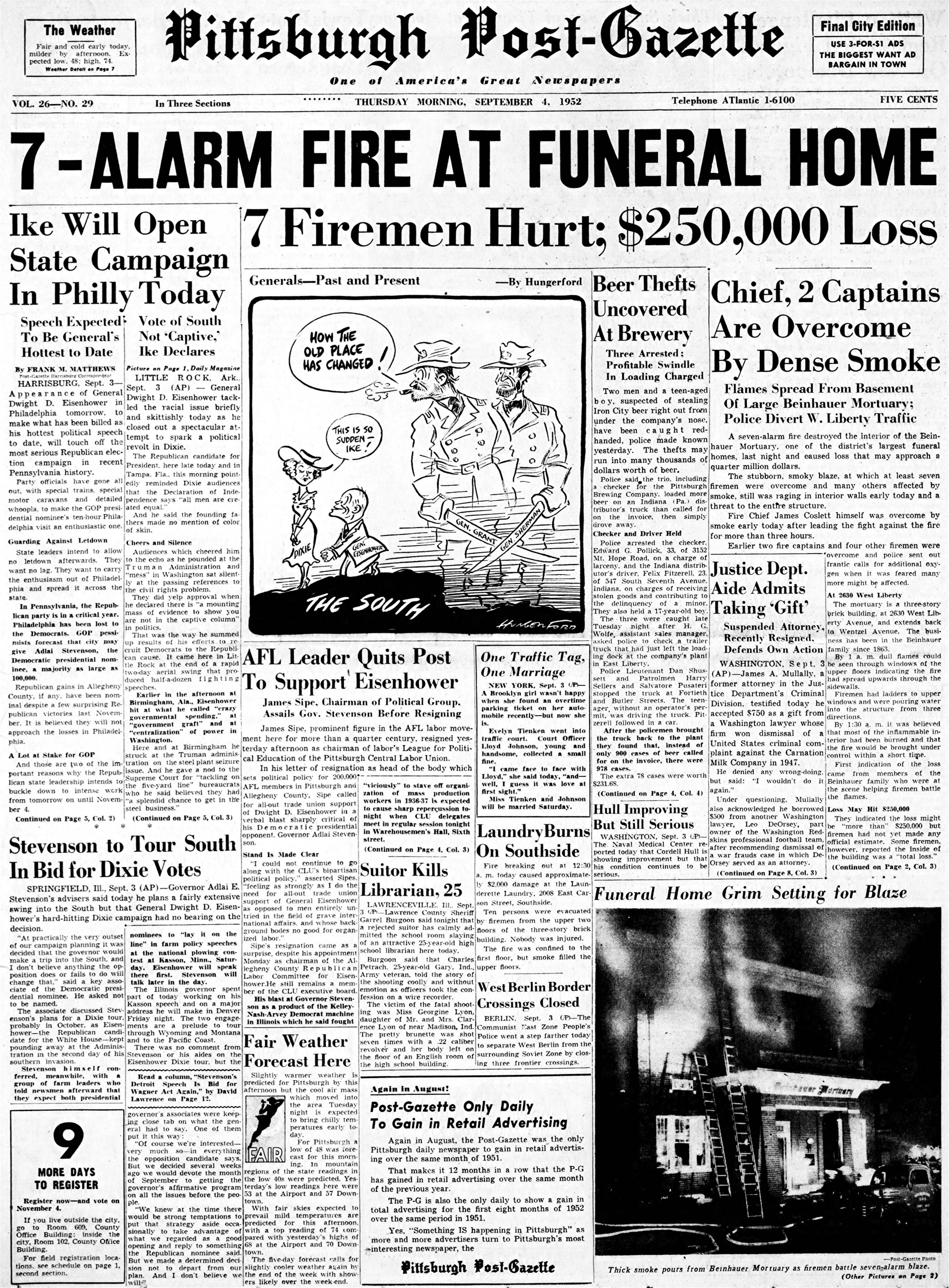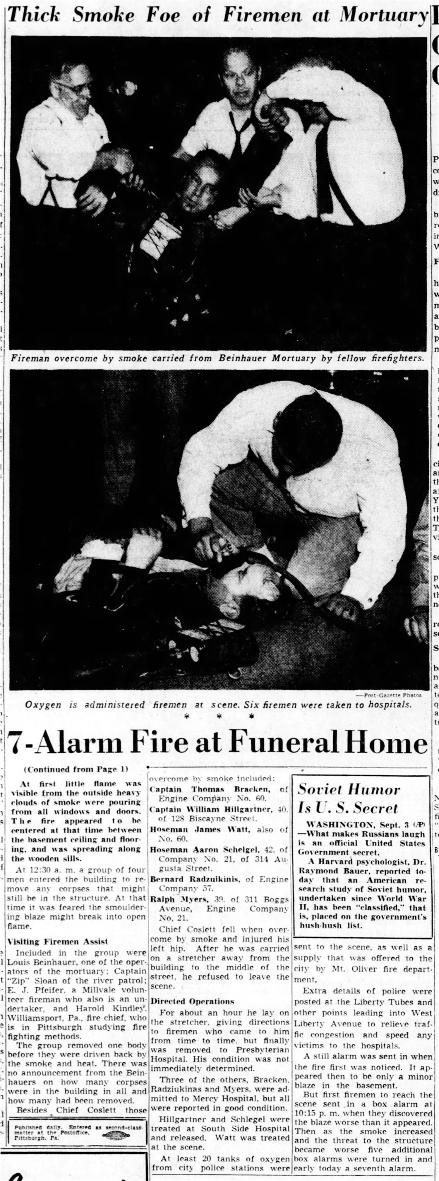 <><><><> <><><><> <><><><> <><><><> <><><><> <><><><> Fire Destroys Mortuary Building - September 3/4, 1952 Tragedy struck on September 4, 1952, when a seven-alarm fire caused irreparable damage to the mortuary building. Scarred walls and charred timbers were all that remained of the thirty-one year old building. The family quickly rebounded from the loss, and a new funeral parlor was constructed shortly afterwards on the same location, one that has been continually enlarged and modernized to this day. <><><><> <><><><> <><><><> <><><><> <><><><> <><><><> Pittsburgh Press, Post-Gazette and Sun-Telegraph Articles * Click on images for readable versions of newspaper pages * <><><><> <><><><> <><><><> <><><><> <><><><> <><><><> The Beinhauer's Brookline Connection Although Beinhauer Funeral Home is located in Beechview, it is often the site of services for residents of the Brookline community, there is another interesting "Brookline Connection" involving the Beinhauer family business. The DeBor family, owners of DeBor Funeral Home on Brookline Boulevard, got their start in the mortuary business at Beinhauer's. Frank F. DeBor, founder of DeBor Funeral Home, had strong ties to the Beinhauer family. His parents, Frank M. and Anna DeBor, both worked for the Beinhauer Funeral Home. Anna was the grand-daughter of Louis Beinhauer, the founder of the Beinhauer family business. Frank also began working for the Beinhauers, and was soon busy arranging and conducting funerals. He and his wife Mary Jo lived for a while on the Beinhauer estate on West Liberty Avenue. In 1950, the DeBor's left Beinhauers to start their own funeral parlor at 1065 Brookline Boulevard.