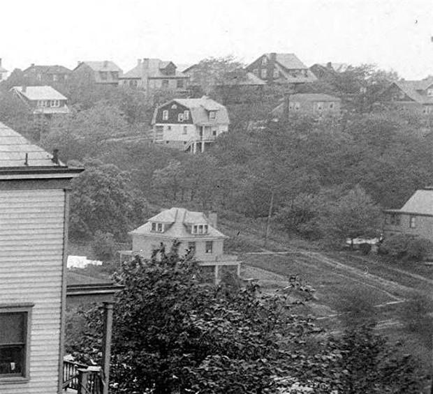 This 1925 photo was taken from atop Rossmore Avenue. It shows parts of Birtley, Berwin and Wolford Avenues during their initial stages of development. Berwin, which runs down the middle of the photo, is just a dirt road with two tire ruts. The same can be said for Wolford, which is at the bottom. This is a good view of Brookline at a time when the housing market in the community was beginning to boom. The wooded area along Birtley and this lower section of Berwin, however, were not developed in earnest until the 1950s. Up until the early-1960s, this part of the street was still paved with a rudimentary coat of asphalt. |