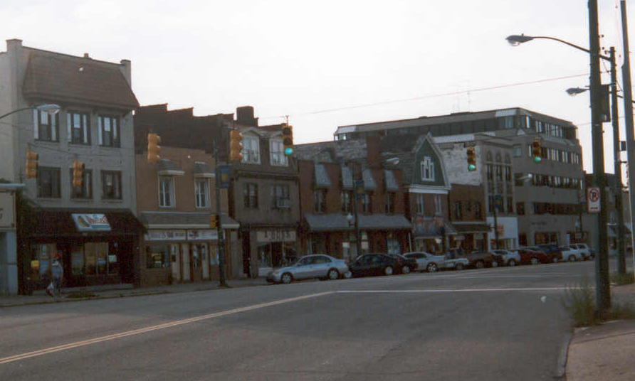 Here is a photo of the 900 block of Brookline Blvd near the intersection with Glenarm Avenue, in 1933. Note the Kroger grocery store. Many of the buildings farther down the Boulevard were destroyed after a fire in 1973, and the Mazza Pavilion (Brookline Terrace) apartments were built in their place. The trolley tracks would be in place for another 33 years, before being removed in 1966. Here is a photo of the 900 block of Brookline Blvd near the intersection with Glenarm Avenue in 2004. It hadn't changed much in seventy years. In 2008 the building where Wanna Be Tan was located (second from the left) was irreparably damaged by fire and has since been razed. Now there is just an empty lot. |