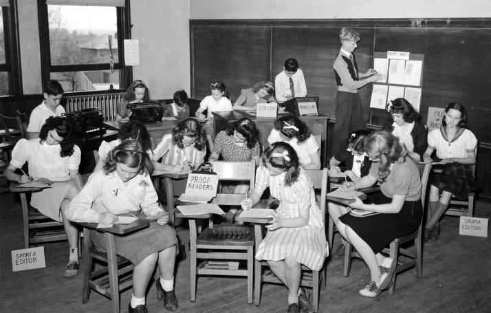 Here is a view inside one of the English or Journalism classrooms in 1945. The students are working on a newspaper. The class is set up like a newsroom. The kids may be working on a school publication. |