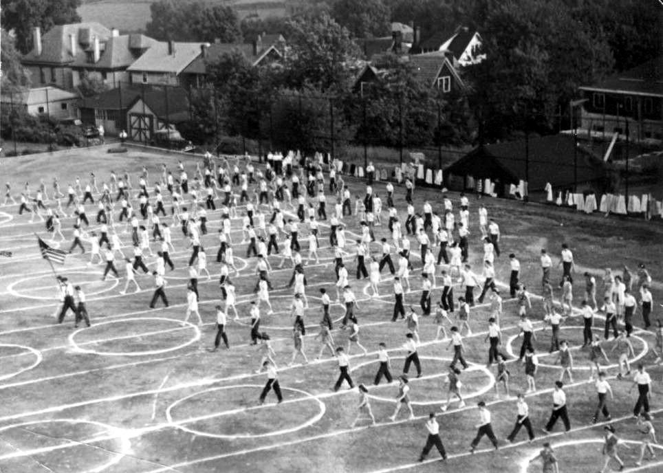 These are photos from a Square Dance held at Brookline Elementary for the students in the Spring of 1947. In the photo above, the students are swinging their partners 'round and 'round on the ballfield adjacent to the school. The photo below shows the students just prior to the dance, marching out onto the field with the colors. It looks as though the 6th, 7th and 8th graders were having a grand time on this special day. Click on photos for larger images * Photos provided by Gordon Malone * |