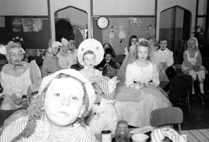 This photo is from Brookline Elementary's 3rd Grade Class Play. The occasion is Christmas 1956 and the kids are dressed up like the many toys Santa brings, as well as his elves. The bride doll is Nikki Gillespie, whose solo song was "I have a pain in my sawdust ..." To the left is Little Bo Peep, and sitting in the back right are Mrs. Claus and Raggedy Ann. In the back by the clock is the cloak room where the students put their boots, coats and umbrellas. The classroom teacher that year was Mrs. Rhodes. Click on image for a larger photo * Photo provided by Nikki Gillespie * |