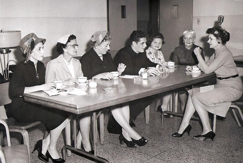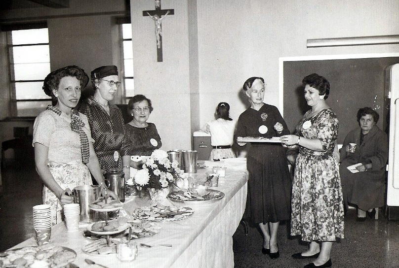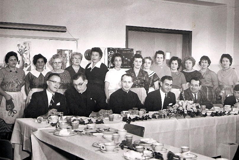 The Loreto Women's Guild hosts an Open House on November 22, 1959. A Women's Guild meeting in 1959. The Holy Name Communion Breakfast on November 13, 1960. Women's Guild members (left to right): Mrs. Calabria, Mrs. Colletti, Mrs. Chianese, Mrs. Zentgraf, Mrs. Munkittrick, Mrs. Donley, Mrs. Gilligan, Mrs. Romanowski, Mrs. Harkins, Mrs. Szolis, Mrs. Loper and Mrs. Jardine. Seated are (left to right): Leo Gutoski, Rev. Paul Lackner, Fathre Garbin, James Priscaro and Adam Stella. Loreto Women's Guild presents new china to Pastor Garbin on November 22, 1960. Pictured are Mrs. Donley, Mrs. Eastland, Mrs. Moorhead, Mrs. Dunlap and Mrs. Harkins. Click on images for larger photos * Photos provided by Our Lady of Loreto Archives * |