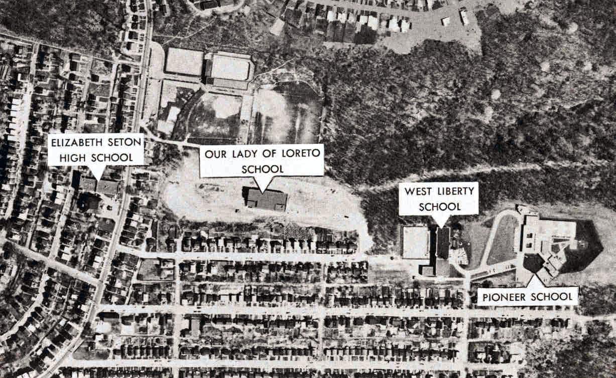 Groundbreaking for Our Lady of Loreto Church/School was held on March 28, 1961. Clearing of the site began the following day. The site chosen was once a popular woodland area referred to as "Our Enchanted Forest." Seven acres were to be cleared for the new building. Four acres were to remain untouched, extending along the lower boundary of West Liberty School. The groundbreaking was the culmination of a two-year struggle to begin construction of the new complex that began in May of 1959 with the establishment of the Our Lady of Loreto parish. From the beginning, the project was beset by difficulties, ranging from unstable land to incompatibilities with the existing sewage lines. Once these obstacles were overcome, construction began in earnest in June of 1961. On September 24, 1961, the cornerstone was laid, and within a year the building was ready for occupancy. Dedication Day was August 22, 1962. Although major construction was complete, there still remained the task of creating a permanent church. For six years, Mass was held in the school gymnasium. Construction of the permanent church began in May of 1969 and was completed in October. The first mass in the new church was held on October 22, 1969, marking the completion of the project begun a decade earlier. Below are photos showing the construction of Our Lady of Loreto Church and School from 1960 through 1962. Loreto is located off of Pioneer Avenue and Chrysler Street, adjacent to Moore Park. It was the fourth offspring parish formed from the original boundaries of Resurrection Church, and the entire cost of construction was $541,650. For over thirty years, the school was one of the premier diocesan institutions, both academically and athletically, but as the local population began a continuous decline, the school struggled financially. Loreto was not the only school in hardship. All three local diocesan schools were in a period of decline. In 1996, Our Lady of Loreto School was merged with Resurrection and St. Pius X to form Brookline Regional Catholic. Some lower grade classes were held in the Loreto school building until 2003, but after that the school was closed. Brookline Regional Catholic was renamed Saint John Bosco Academy in 2014 and, with the student enrollment at an all-time low, the school was permanently shuttered in 2019, the last of the parochial schools in the neighborhood. Through it all the parish continued on, with services held weekly until August 30, 2020, when a "Mass of Farewell" was held by Pastor James Bachner putting an end to Our Lady of Loreto's glorious and spiritually lifting sixty-one year history. Click on images below for larger pictures * Photos provided by Our Lady of Loreto Archives * |