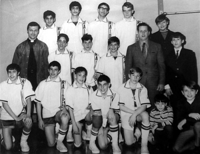 1969-70 Resurrection Raiders Varsity basketball team. Members of the team included Jim Marshall, John DeFilippo, Jimmy O'Toole, Bobby Gattuso, Jim O'Rourke, Jack Walsh, Mike Casciato, Warren DelRaso, Dan Korinko, Mike Mezyk, Pat Connors, Kevin Bradley, Don Fuchs and manager Fred Hartman. The coach is Ben Hartman. Click on image for a larger picture * Photo provided by Loretta Walsh Bucci (from Growing Up In Brookline) * |
