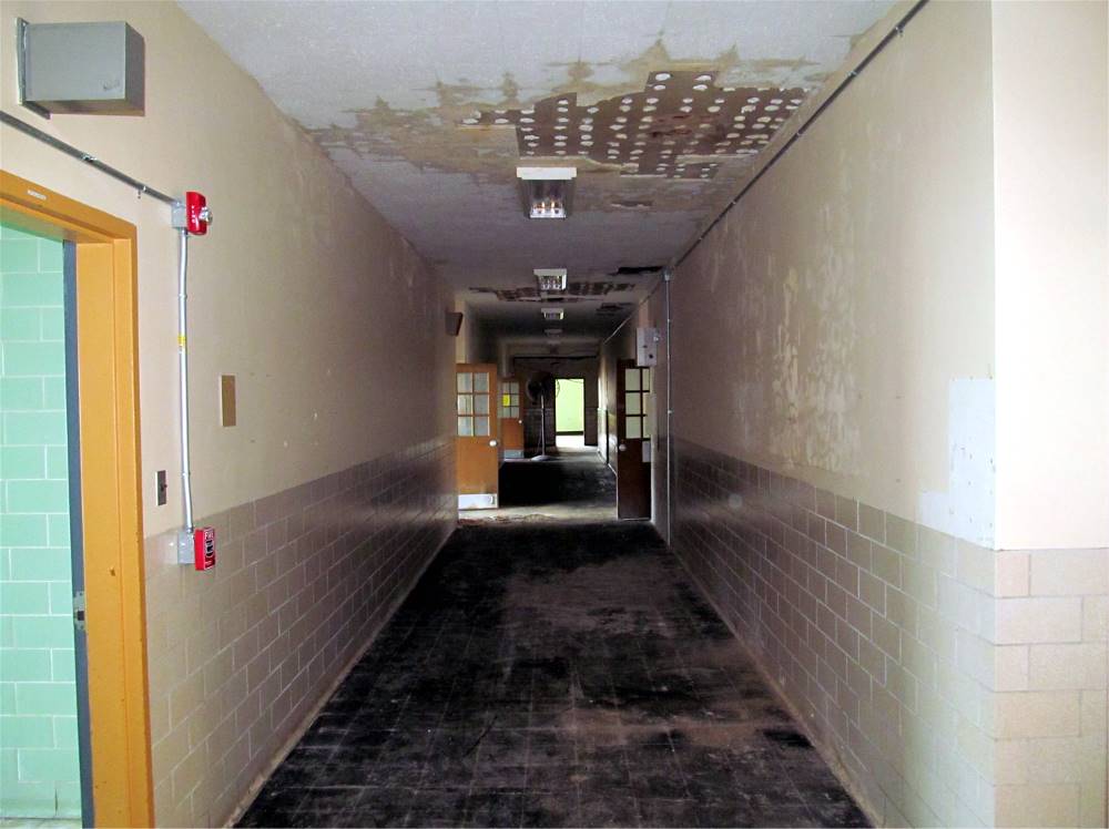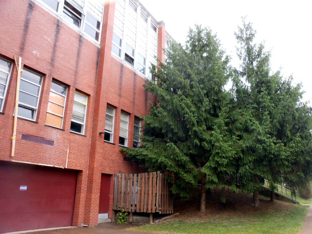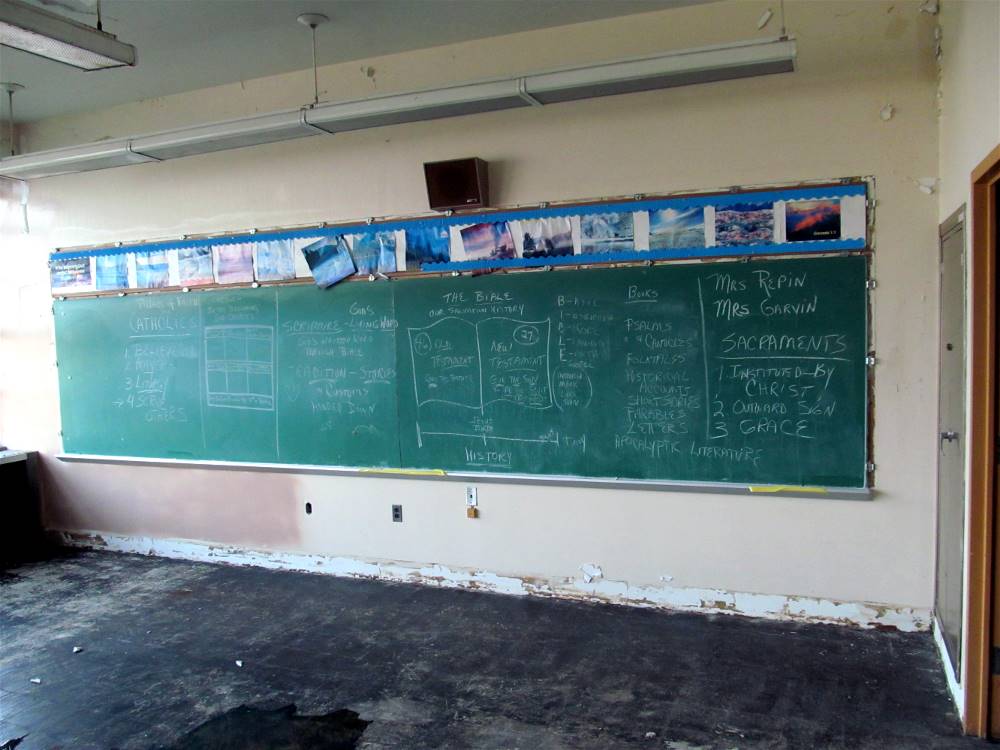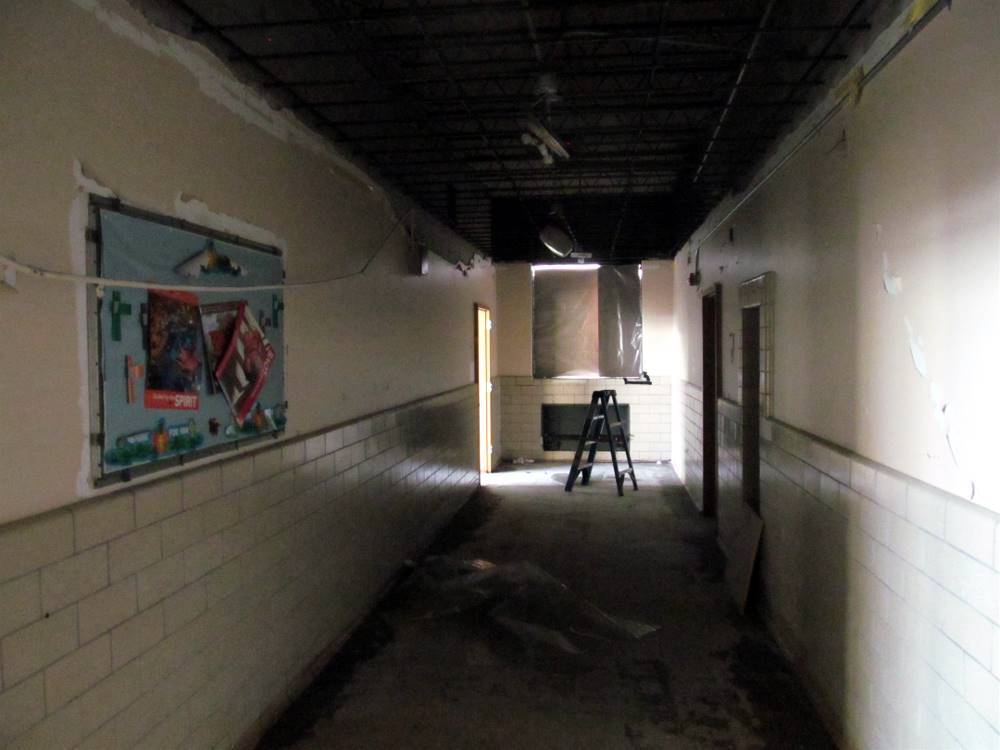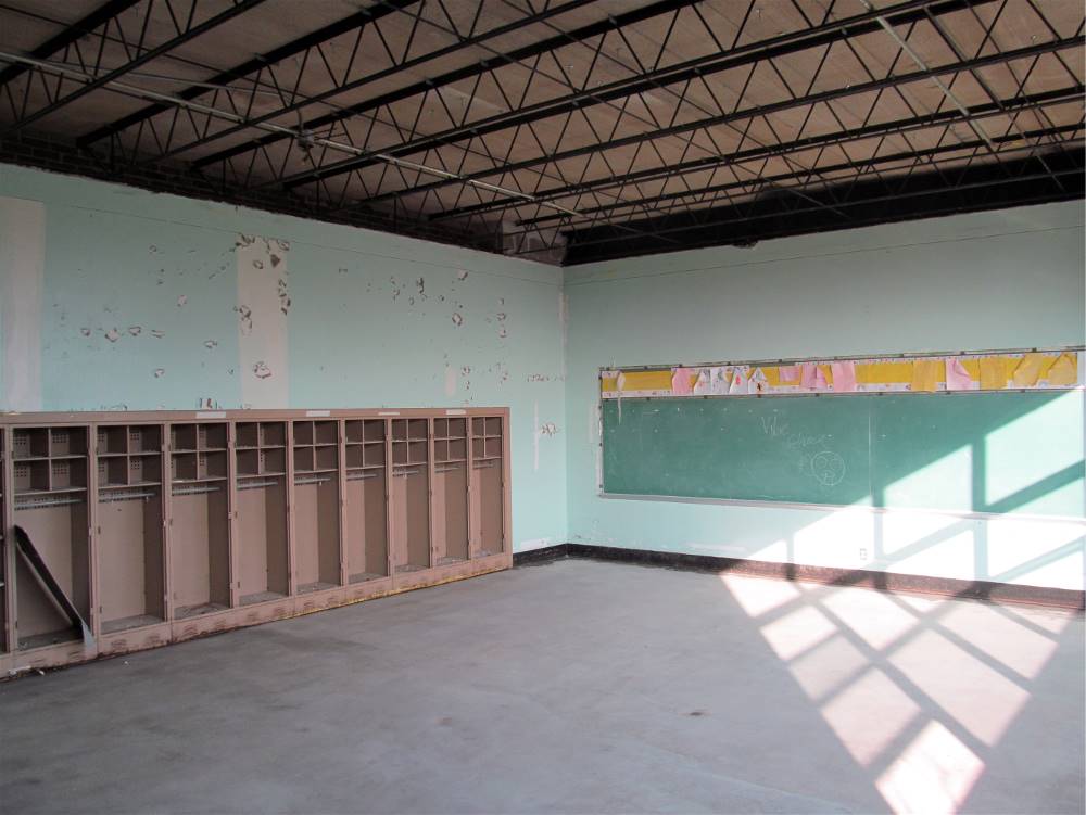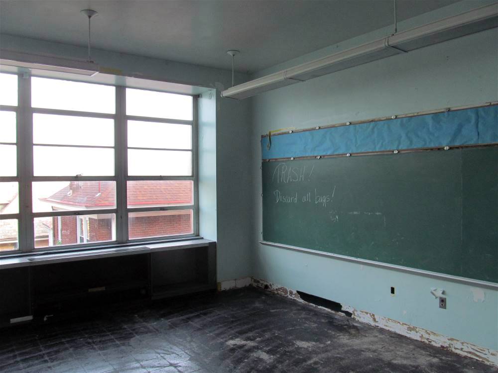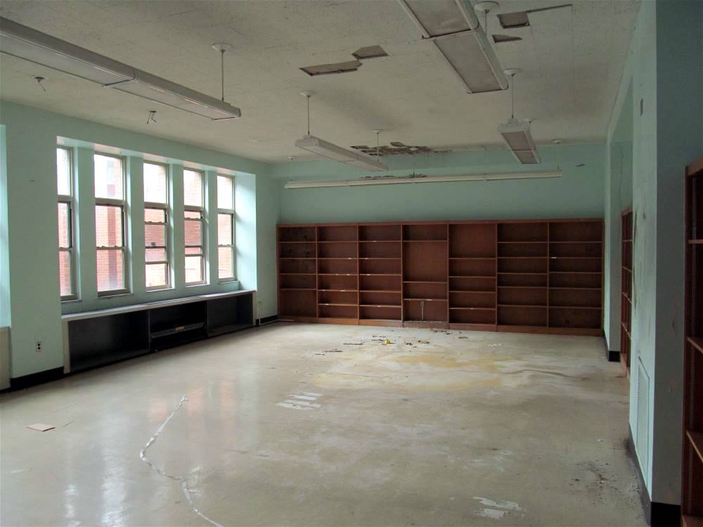 Here are some photos from September 2020 showing the condition of the Resurrection Activities Center/Middle School prior to the planned demolition of the building. Resurrection School opened in 1912. The original structure was enlarged three times as the student population increased. The first section of the adjacent middle school, with six classrooms, was built in 1957. The Activities Center followed in 1964/65. The Activities Center contained seven classrooms, a meeting and banquet hall (The Garden Room), a library, a large garage and an gym/auditorium with boys and girls locker room facilities. For over three decades the Activities Center/Middle School building was alive with activity. However, due to declining enrollment, the school closed in 1996.
