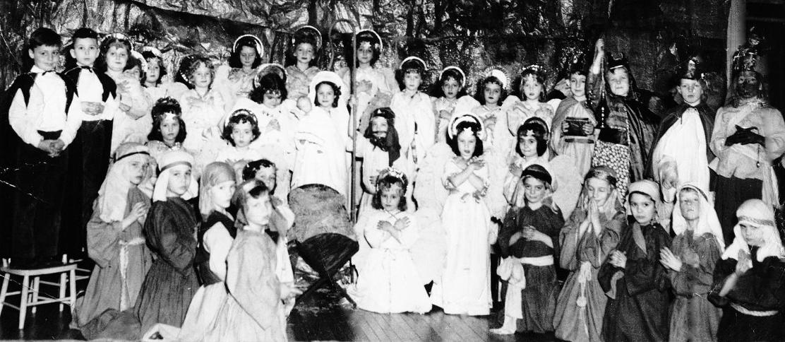 Here is the cast of Resurrection's 1950 2nd Grade Christmas play about the birth of the baby Jesus. The photo was provided by Brian Fornear, second from the right in the back row, who played Herod. Brian remembers his one line in the play, "Bring me the three wise men", which he said forcefully while waving his sceptor. This was a big day for the second graders, who practiced long and hard to put on a good show for the many parents and parishioners who came to see the production. Click on image for a larger photo |