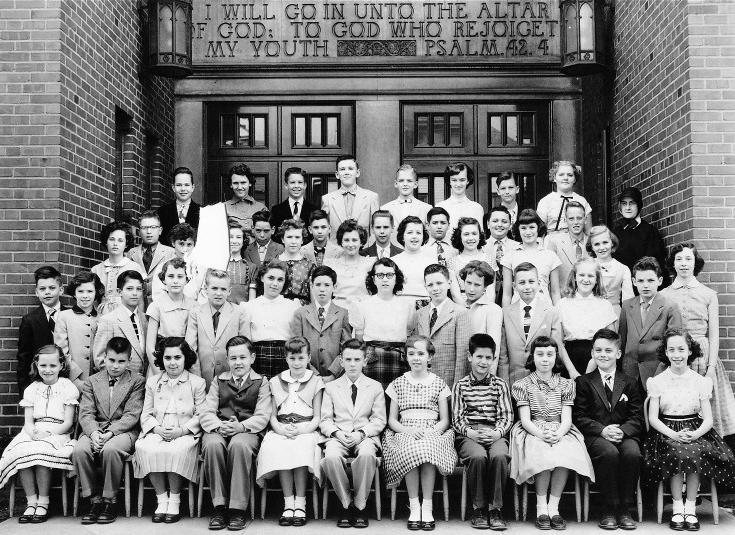 Resurrection Elementary in 1954. Among those in the photo are: Click on image for a larger photo * Photo provided by Brian Fornear, second row, sixth from right * |