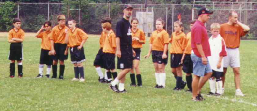 Coaches Chris Rossetti and Mike Vaughan look like they forgot something as Referee Dave Osterman prepares to give pre-game instructions to ChrisLynn Energy. |