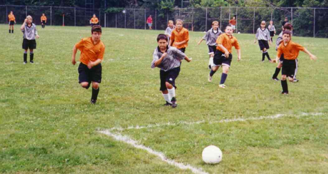 Beinhauer's and ChrisLynn players race to get to the ball.
