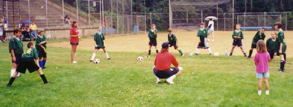 Darryl Hall and his Kribel's Bakery squad also limber up before their game. The boys and girls in blue outstretched their DeBor opponents by six goals in a 9-3 win. |