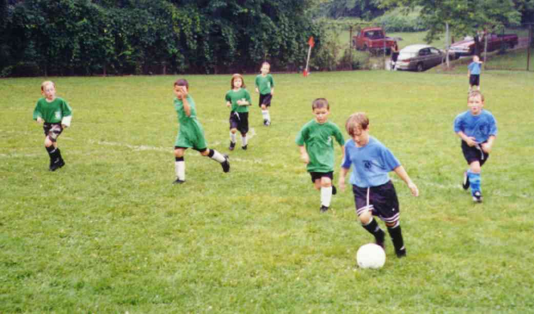 A Light Blue midfielder takes the ball over the center line as the opposition gives chase.