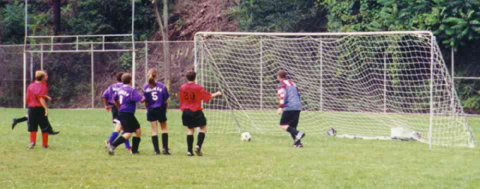 That ball has eyes for the net. A perfectly placed shot by Danny D finds eases its way past the goalkeeper to preserve a 2-2 tie with Pallone K9's. |