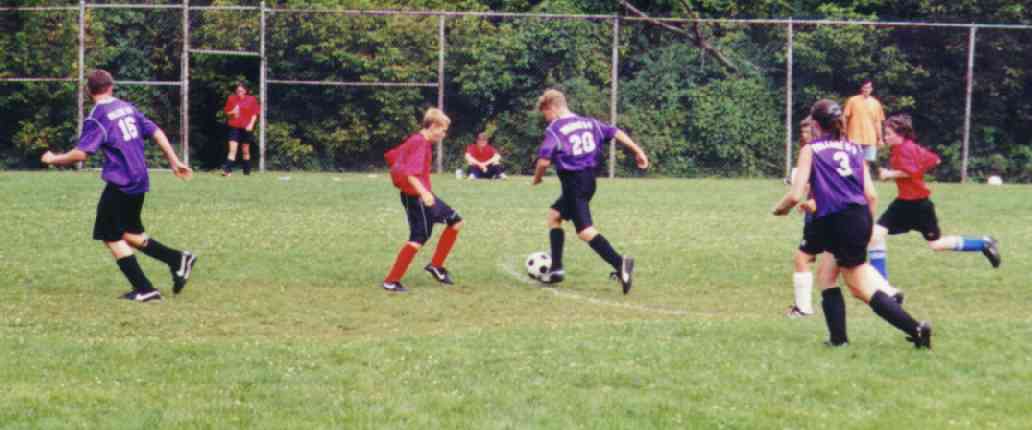 Pallone's K9s are again on the prowl, opening their season with a 2-2 tie against Jackson-Hewitt. Here, the K9 midfielders move the ball into Jackson territory. |